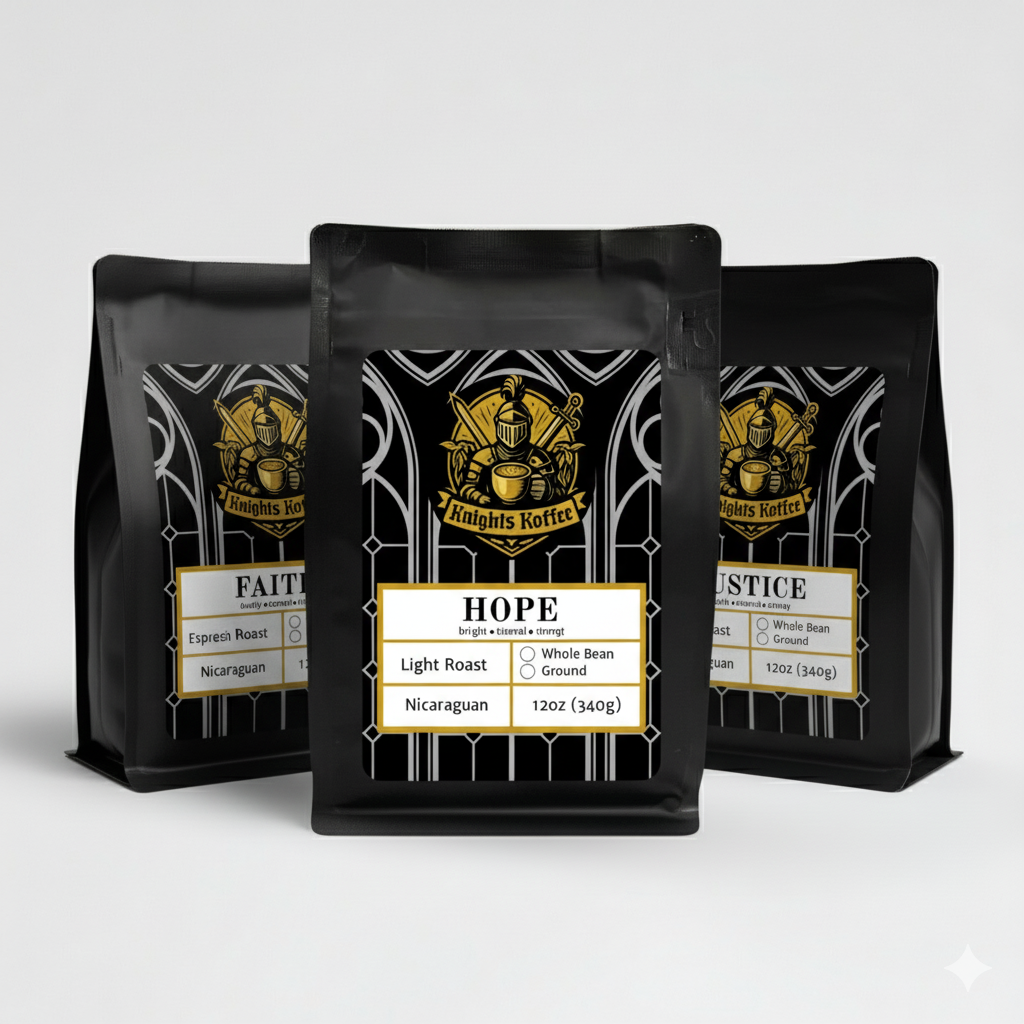 Knights Koffee isn’t just inspired by the faith — it’s built on it. Founded and run by practicing Catholics, our mission is simple: serve great coffee while honoring God, family, and fraternity. Every bag you brew supports a brand rooted in Catholic values of service, charity, and truth. From our daily prayers to our daily roasts, we keep Christ at the center of it all. -